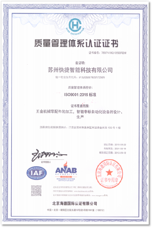 截止2025年,快捷智能已榮獲國家高新技術企業(yè)、科技型中小企業(yè)、瞪羚企業(yè)、專精特新中小企業(yè)、企業(yè)技術中心等多項榮譽,通過質量管理體系認證等多項企業(yè)和產(chǎn)品認證。